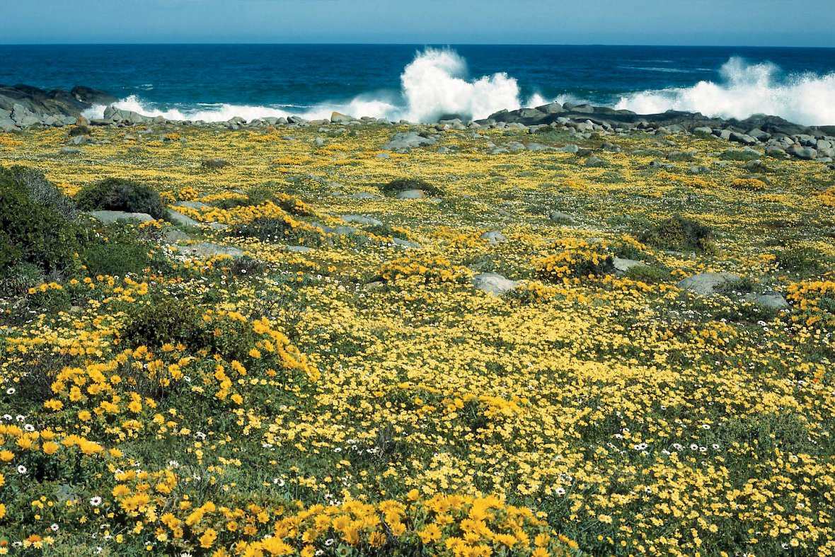 Von Naries geht es weiter durch das Namaqualand, wo Sie in der Saison das Blumenmeer bestaunen, das sich links und rechts der Straße auf insgesamt ca. 50.000 km² erstreckt. Clanwilliam ist als Welthauptstadt des Rooibos bekannt. Im „Rooibos Tea House“ lernen Sie mehr über die besondere Pflanze und ihre Verarbeitung und können die verschiedenen Sorten probieren. Die angrenzenden Zederberge sind nicht nur ein Paradies für Wanderer. Hier werden auch einige der besten Weine des Landes angebaut, wovon Sie sich beim Besuch des Cederberg Weinguts überzeugen können. Entlang des Brannewynflusses findet man den Sevilla Rock Art Trail. Hier haben sich über die Jahrtausende die San – die ursprünglichen Bewohner Südafrikas – mit Felsmalereien verewigt.